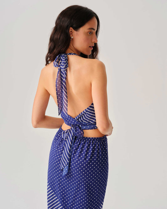 An ode to summer, cut in custom-printed silk chiffon. The Lana Set combines a draped cowl neck top with an ankle-grazing skirt, both double-layered with silk for weightless coverage and soft movement.