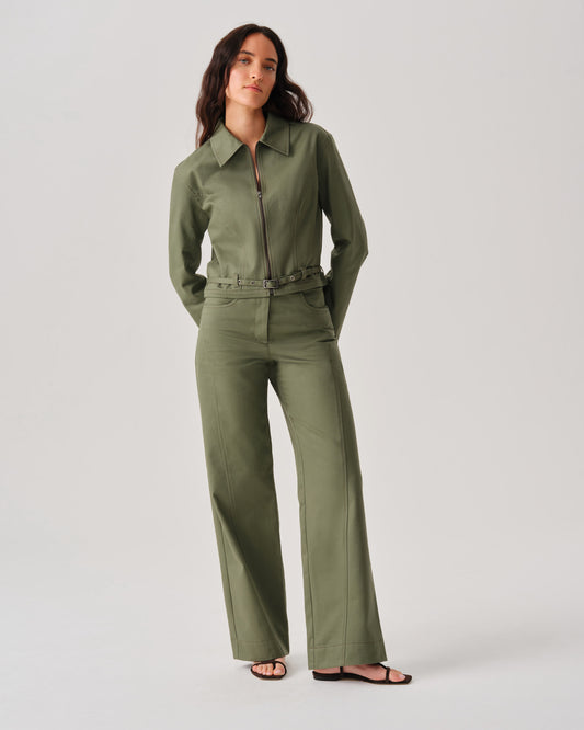 The Sloane Set combines utility and polish with a tailored fit and unexpected seam detailing. Made from structured cotton twill with contrast stitching, each piece is finished with signature tartan lining and gunmetal hardware. The jacket features an adjustable belt for customizable shaping, while the wide-leg pant includes refined touches like curved pockets, tack buttons, and a foldable hem.